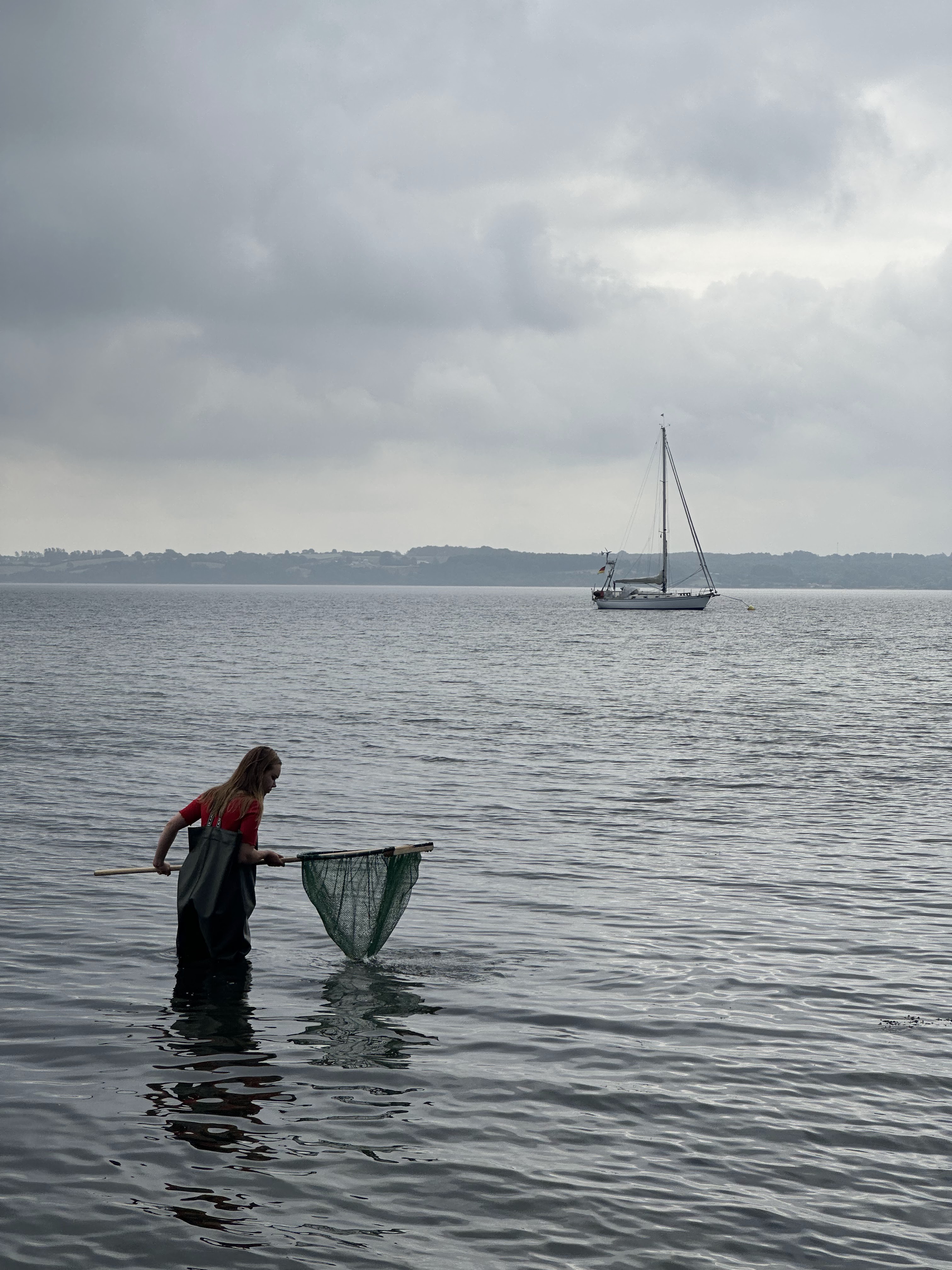 Vi hoppede i nogle wader og tog en rejestryger i hånden og så ud i vandet.